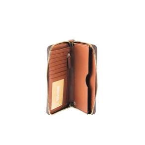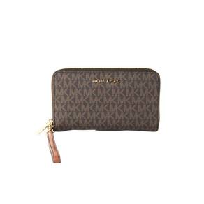 Lona revestida com assinatura MK com acabamento em couro saffiano e ferragens douradas. Fecho de zíper. Ferragens de letras com logotipo MK. Alça de pulso removível, 15 cm. Interior: bolso para moedas com zíper, seis compartimentos para cartões de crédito, compartimento para celular e janela para identidade. Medidas aproximadas do tamanho: 17 cm L x 10 cm A x 2,5 cm P. - Michael Kors Feminino - 18 cm de largura 10 cm de altura 2,5 cm de largura - 6 porta-cartões mais 1 janela para identidade - Detalhes do interior: um bolso para moedas com zíper, um bolso para celular, um bolso aberto - Compatível com iPhone 4,5,6,7, 7S, 8, 8S e Samsung Galaxy