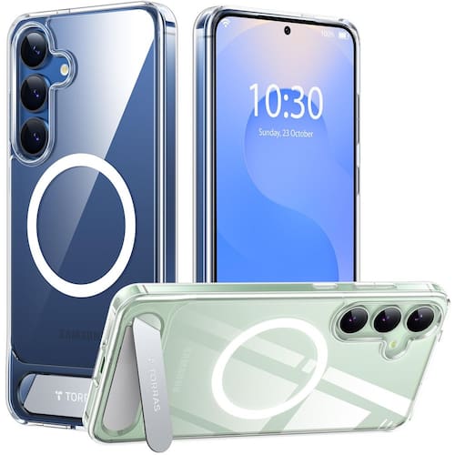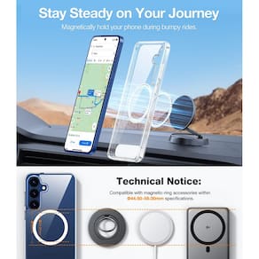CapaCapa para celular - Stand Up, Power Up: TORRAS Magnetic Case Leader. Desde 2022, criamos ótimas capas magnéticas para usuários Samsung. Nossa capa para Samsung Galaxy S25 Plus usa ímãs de neodímio de grau N52 com tecnologia exclusiva MegaMag-Boosted Magnetism para tornar a atração magnética extremamente poderosa. Uma placa fina e plana em forma de suporte oferece uma experiência de inclinação multiângulo e mãos livres, enquanto seu magnético integrado garante carregamento sem fio ininterrupto - Experiência de carregamento sem fio: Desfrute de estabilidade magnética confiável com uma atração 60% mais forte em comparação com outras soluções. Com força magnética poderosa de 18N, seu novo S25 Plus pode aderir a qualquer acessório magnético. Além disso, o forte recurso magnético da capa S25 Plus também garante uma experiência eficiente de carregamento sem fio e um suporte seguro no suporte do seu carro - Diamante transparente e antiamarelamento: a parte traseira é feita de materiais de PC premium Bayer, apresentando um nano-revestimento na superfície que resiste efetivamente a manchas e suor. Testes de laboratório mostram que a duração antiamarelamento da nossa capa transparente para Samsung S25 Plus excede a de capas transparentes comuns em mais de 6 vezes. Ela não apenas evita o amarelamento, mas também possui uma taxa de transmissão de 99%, mostrando a cor autêntico do telefone com total clareza - Proteção certificada de grau médio: esta capa é a melhor garantia para o seu novo telefone, libertando-se de choques e quedas inesperados. A estrutura de amortecimento de ar TORRAS X-Shock e o material TPU altamente resiliente oferecem proteção sólida para cada borda do seu telefone. A capa para Samsung S25 Plus possui bordas elevadas de 1,0 mm para a moldura da tela e 1,5 mm para a câmera, protegendo o design angular do seu telefone - Um suporte durável integrado para suporte em vários ângulos: Certificada por mais de 30.000 testes rigorosos de dobra, a capa S25 Plus com suporte é construída com suporte exclusivo de aço inoxidável integrado para maior durabilidade. Os modos vertical e horizontal flexíveis permitem que você assista confortavelmente a vídeos ou conduza reuniões de negócios. Este suporte pode se misturar em todos os cenários da sua vida