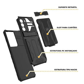 DESCRIÇÃOUse a melhor capa para Samsung Samsung Galaxy S21 FEA Capa Guardian da Gshield foi desenvolvida para proteger seu aparelho, com a mais alta tecnologia de absorção de impactos, garantindo extrema segurança. Fabricado com um design leve e fino, mas sem perder a segurança de proteção para seu celular.A Guardian possui um encaixe perfeito para adaptar-se totalmente ao seu aparelho; possui uma alça Kickstand, que permite utilizar o celular apoiado na horizontal, além disso, oferece um compartimento exclusivo para guardar seus cartões. ESPECIFICAÇÕESMaterial: Poliuretano termoplástico + PC de alta resistência - Não amarelaMarca: GshieldDimensões: Dimensões exatas do aparelhoCor: PretoCertificações: Us Military