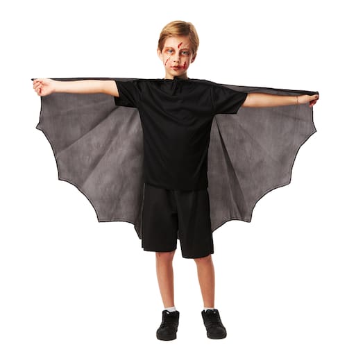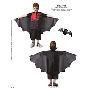 A capa é leve e confortável, perfeita para as travessuras e gostosuras da noite de Halloween. Seu design especial com recortes na barra imitando asas de morcego adiciona um toque assustador e misterioso à fantasia.