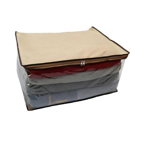 CAIXA MULTIUSO TNT 60x45x30 Os produtos Ribercapas são muito conhecidos no mercado por sua eficácia na hora de organizar a casa. A Capa mantém suas roupas protegidas na hora de organizar no seu guarda roupa, closet ou armário. É um produto muito resistente e protege a roupa contra bolor, sujeira e ações do tempo, produto ideal para a armazenagem de camisas, calças, saias, casacos e vestidos dos mais diversos. Um produto prático, fácil de utilizar e com fecho por zíper. ESPECIFICAÇÕES TÉCNICAS: - Medida cm : 60X45 - Altura cm : 30 - Material: 80%Tnt 0,40gr e 20 % Policloreto de Vinila Pvc Transparente , com visor frontal em Pvc Cristal - Cor: Bege Com Borda Marrom - Marca: Ribercapas Obs: Os demais itens das fotos são meramente ilustrativos e não fazem parte do conteúdo da embalagem. Ean: 7908204600039