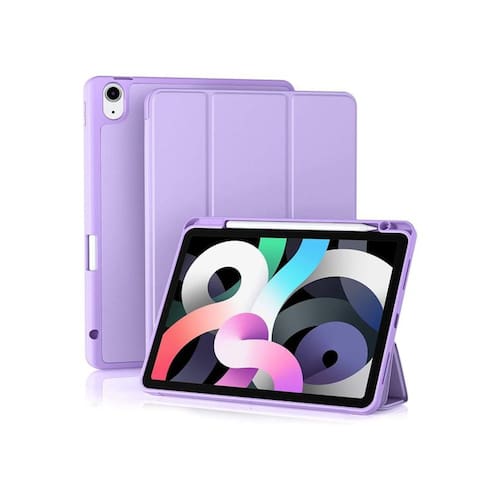 Capa inteligente para Air de 4ª e 5ª geração com compartimento para lápis. Disponível em 6 cores: preto, cinza, lavanda, azul marinho, rosa e azul claro. A capa é feita de três painéis magnéticos, capazes de formar um triângulo e posicionar o da maneira mais adequada para você. Possui tecnologia inteligente, o que significa que quando você abre/fecha a capa, seu é desbloqueado/bloqueado automaticamente. Com esta capa incrível, você pode manter seu totalmente protegido sem perder nenhuma de suas funções, já que você pode continuar carregando seu lápis magneticamente. O slot de armazenamento da caneta está localizado no lado oposto da porta de carregamento magnético e, no lado da carga magnética, há uma fenda projetada para que o lápis possa ser preso e carregado. Modelos : A2588, A2589, A2591, A2316, A2324, A2325, A2072.