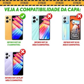 Essa capa é compatível exclusivamente com o modelo Infinix Hot 30I, não servindo em outras versões. Portanto, tenha certeza de que seu celular é compatível antes de fazer a compra.