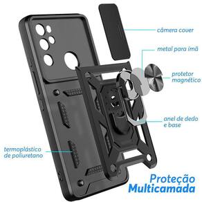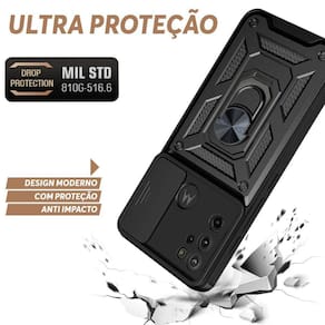Características técnicas: - Capa capinha case para Motorola Moto G60S - Cor: preto - Alta proteção com proteção anti impacto de dupla camada - Ótimo acabamento com alto relevo na parte que protege a câmera - Funções adicionais: anel de dedo e metal embutido para aderir em imã, anel ajustável para função de base - Encaixe perfeito para o Motorola Moto G60S - Slide cover para maior proteção das câmeras e maior privacidade - Todas as funções e botões do celular funcionam normalmente com a capa - Compatível apenas com o Motorola Moto G60S