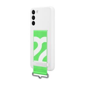 Capa de silicone oficial Samsung para S22+ com alça integrada. Produzida com plástico reciclado pós-consumo, possui acabamento fosco e toque suave. A alça larga é destacável e permite uma pegada segura. Cor branca com alça verde.Características