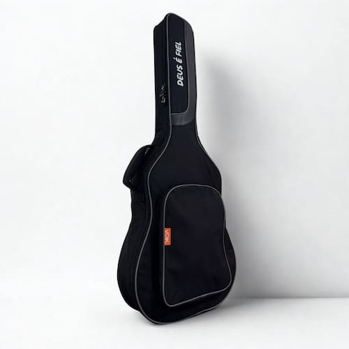 A Capa Para Violão Acolchoada Deus é Fiel Preta Voik BG41-060 é a escolha ideal para quem busca proteção superior, praticidade e estilo ao transportar seu instrumento. Com um acolchoamento robusto de 1,3 cm, ela protege seu violão de arranhões, impactos e batidas, enquanto a resistência à água garante segurança mesmo em situações de garoa ou umidade. O transporte é extremamente confortável graças às alças de ombro duplas ajustáveis, no estilo mochila, além de uma alça de mão que facilita o manuseio em diferentes ocasiões. Os bolsos externos com zíper oferecem espaço extra para armazenar acessórios essenciais como palhetas, afinadores e cordas, mantendo tudo organizado e acessível. A estampa exclusiva "Deus é Fiel" adiciona um toque de personalidade e fé, transformando a capa em um item único e expressivo. Compatível com violões que variam entre 38 cm e 42 cm de largura e de 100 cm a 107 cm de comprimento, ela se adapta facilmente a diversos modelos. Diferenciando-se de capas comuns, a Voik BG41-060 oferece acolchoamento espesso, resistência à água, alças ergonômicas e uma estampa exclusiva, tudo isso com excelente custo-benefício para quem não abre mão de segurança e estilo.