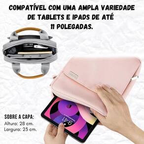 Capa pasta bolsa com alça para lenovo tab m11 11 polegadas Cores: rosa Nossa bolsa é completa para proteger e transportar seus tablets e ipads de até 11 polegadas. Com um compartimento principal espaçoso, um bolso frontal com zíper e um bolso de malha, você terá espaço de sobra para todos os seus acessórios essenciais. Além disso, um bolso reforçado especialmente projetado para seu tablet ou garante que seus dispositivos estejam sempre seguros. imagine a conveniência de carregar seu dispositivo com total conforto graças à alça regulável que oferece múltiplas opções de transporte. Seja para o trabalho, estudo ou lazer, essa bag se adapta às suas necessidades diárias. fabricada com materiais de alta qualidade, ela é resistente à água e possui um zíper robusto que proporciona um fechamento seguro, mantendo seu tablet ou protegido em qualquer situação. não perca a chance de adquirir esta bag versátil e de alta capacidade. Compatível com uma ampla variedade de tablets e ipads de até 11 polegadas, ela é a escolha ideal para quem busca praticidade e proteção premium. ------------------ ------------------ quais dispositivos são compatíveis com esta case bag R: a case bag é compatível com uma ampla variedade de tablets e ipads de até 11 polegadas. a alça da case bag é ajustável R: sim, a case bag possui uma alça regulável que oferece múltiplas opções de transporte, permitindo que você a use de diversas formas para maior conforto e praticidade no seu dia a dia. esta case bag é adequada para viagens R: sim, com sua construção resistente, proteção contra água e alça regulável, esta case bag é perfeita para viagens, proporcionando segurança e conveniência para transportar seus dispositivos e acessórios. quais compartimentos e bolsos estão incluídos na case bag R: a case bag inclui um compartimento principal espaçoso, um bolso reforçado para tablet ou , um bolso frontal com zíper, um bolso de malha e bolsos específicos para canetas e acessórios. ------------------ Especificações ------------------ Altura: 28 cm. Largura: 23 cm. Alça regulável Compatível com uma ampla variedade de tablets e ipads de até 11 polegadas. ------------------ Conteúdo ------------------ 1x bolsa universal. Anúncio referente a bolsa Acessórios que ambientam as fotos não inclusos. ------------------ Apresentação: ------------------ - qualidade garantida. - atendimento qualificado. - enviamos para todo o brasil. - compra garantida. - despachamos em até 1 dia útil após confirmação do pagamento Garantimos a devolução por arrependimento em até 7 dias, após o recebimento e de 15 dias contra defeitos de fabricação. Marca: Não Informado