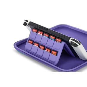 - A aba protetora de tela acolchoada integrada inclui armazenamento de jogos para dez cartas de jogo