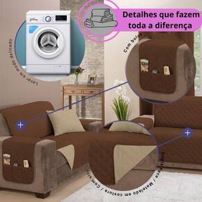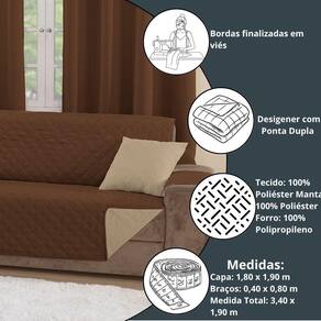 Capa Protetora de Sofá King 3 Lugares Manu Matelado Dupla Face Variação: Cáqui e Marrom Protetor de Sofá Manu 3 Lugares King - Dupla Face, Estilo Matelado com Bolsos Laterais Renove a decoração da sua sala com o Protetor de Sofá Manu 3 Lugares King, um modelo elegante e funcional, perfeito para quem busca proteção, estilo e praticidade no dia a dia. Com design reversível e acabamento matelado em losangos, ele é a combinação ideal de versatilidade e sofisticação. Dupla Face - 2 Cores em 1 Produto Transforme o ambiente sempre que desejar A capa de sofá Manu é reversível, com cores distintas em cada lado, permitindo que você altere o visual da sua sala de forma rápida e prática. Design Matelado Elegante Com costuras em linha que formam desenhos de losangos, o protetor traz um visual moderno e requintado, elevando o estilo do seu estofado. Bolsos Laterais Funcionais Porta-Objetos Conta com bolsos estrategicamente posicionados em um dos braços, ideais para armazenar controles, livros, revistas ou pequenos itens do dia a dia. Os bolsos permanecem funcionais em qualquer lado da capa. Acabamento com Viés - Mais Durabilidade e Estilo O acabamento reforçado com viés nas bordas garante um toque de elegância e maior resistência ao uso contínuo. Medidas Aproximadas Largura x Altura : Capa Principal: 1,80 m x 1,90 m Braços costurados à capa : 0,40 m x 0,80 m cada Medida total com braços: 3,40 m x 1,90 m Importante: Meça a largura do assento do seu sofá de braço a braço, sem incluir os braços para garantir o encaixe ideal. Composição do Material: Tecido Superior e Inferior: 100% Poliéster Manta Interna: 100% Poliéster Características: dupla Face reversível com Bolsos porta-objetos acabamento com Viés matelado em Linha lavável em Máquina modo delicado Informações Importantes: Os bolsos estão presentes em apenas um dos braços, variando entre o lado direito ou esquerdo conforme o lote. As cores podem sofrer variações de tonalidade devido à iluminação da foto e ao monitor. A imagem pode ilustrar outro tamanho do produto - verifique sempre as medidas na descrição. Conteúdo da Embalagem: 1 Protetor de Sofá Manu 3 Lugares King com Bolsos : contra defeitos de fabricação. Marca: Não Informado Ean: 7890888854863