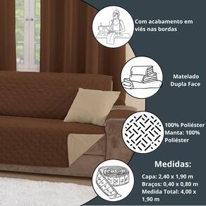 Capa Protetora de Sofá King 4 Lugares Manu Matelado Dupla Face Variação: Cáqui e Marrom Bem-vindo à Atual Ecommerce Se você procura unir bom gosto e praticidade na proteção dos seus móveis, está no lugar certo. Nossa linha de capas protetoras vai transformar a sua sala com estilo e funcionalidade. Apresentamos a Capa Protetora de Sofá King 4 Lugares Manu Matelado Dupla Face Um toque de elegância com proteção total para seu estofado Seu sofá vive exposto a sujeira, manchas ou pelos de pets O modelo Manu resolve esse problema com um design moderno, funcional e versátil. A capa oferece dupla face, matelado com costuras em losangos, bolsos laterais e acabamento em viés. Tudo isso pensado para deixar seu ambiente mais bonito e prático. Veja como outros clientes já transformaram seus lares: fiquei encantada com a qualidade A costura é linda e o tecido resistente. troco de lado toda semana É como se tivesse duas capas. os bolsos são muito úteis. Agora o controle não some mais Especificações Técnicas: Modelo: Manu King Matelado Medidas: Assento: 2,40 m Capa: 2,40 x 1,90 m Braços: 0,40 x 0,80 m Total com braços: 4,00 x 1,90 m Composição: Tecido superior e inferior: 100% Poliéster Manta interna: 100% Poliéster Diferenciais: Matelado em linha com desenho de losangos Dupla face com duas cores Bolsos laterais porta-objetos Acabamento com viés Lavável à máquina modo delicado Observações: Os bolsos estão presentes em apenas um dos braços. As cores podem variar de acordo com o lote ou monitor. Verifique sempre as medidas na embalagem. de 3 meses contra defeitos de fabricação Compre com total confiança e tranquilidade. Não perca a chance de renovar seu ambiente com estilo e proteção Agradecemos sua visita à Atual Ecommerce. Conte conosco para transformar sua casa O que o cliente vai receber: 1 Capa Protetora de Sofá King 4 Lugares Manu Matelado Dupla Face Marca: Não Informado