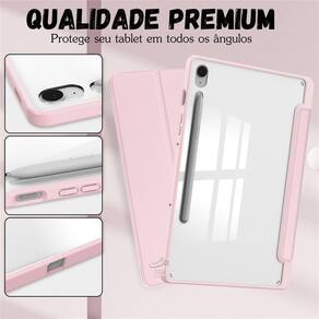 A parte traseira da capa é feita de acrílico, que não amarela com o tempo, mantendo a aparência elegante do seu dispositivo por mais tempo. Agora você não precisa se preocupar em derrubar o tablet e quebrar a tela, ou notar que a parte de trás está ficando amarelada.