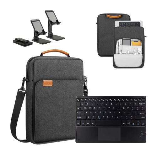 Capa + suporte + teclado sem fio para samsung s10+ 12.4 x820 Cor: preto O kit 3 em 1 reúne os acessórios ideais para transformar seu tablet ou em uma verdadeira estação de trabalho portátil. Composto por uma case bag transversal, um teclado com touchpad e um suporte universal ajustável, o conjunto é perfeito para quem busca conforto, produtividade e mobilidade no dia a dia. Compatível com tablets e ipads de até 13 polegadas, o kit é ideal para home office, estudos, viagens ou trabalho em movimento. A bolsa possui design moderno e material resistente à água, oferecendo segurança ao transportar seus dispositivos. O teclado bluetooth proporciona digitação fluida e touchpad integrado, enquanto o suporte dobrável garante o ângulo perfeito e uma postura ergonômica durante o uso. Perfeito para quem quer unir estilo, funcionalidade e desempenho em um único kit compacto ------------------ ------------------ O teclado é compatível com qualquer tablet R: sim, o teclado é compatível com tablets e ipads de até 13 polegadas que possuam conexão bluetooth. O teclado tem touchpad integrado R: sim, o teclado possui um touchpad sensível e preciso, permitindo controle total sem precisar de mouse. O suporte é ajustável R: sim, o suporte universal é dobrável e permite ajustar o ângulo de visualização conforme sua necessidade. A bolsa é impermeável R: a case bag possui material resistente à água, ideal para proteger seus equipamentos durante o transporte. A bolsa é impermeável R: a case bag possui material resistente à água, ideal para proteger seus equipamentos durante o transporte. O teclado precisa de pilhas R: não. Ele é recarregável por cabo usb incluso. ------------------ Especificações ------------------ Tipo de conexão: bluetooth Teclado: recarregável via usb Tamanho do teclado: 24cm x 15cm. Tamanho da case bag: 35.5cm x 28cm Compatibilidade: tablets e ipads de até 13 polegadas ------------------ Conteúdo ------------------ 1x case bag transversal 13 1x teclado com touchpad 1x suporte universal ajustável Anúncio referente a kit para tablets e Acessórios e aparelhos que ambientam as fotos não inclusos. ------------------ Apresentação: ------------------ - qualidade garantida. - atendimento qualificado. - enviamos para todo o brasil. - compra garantida. - despachamos em até 1 dia útil após confirmação do pagamento Garantimos a devolução por arrependimento em até 7 dias, após o recebimento e de 15 dias contra defeitos de fabricação. Homologação Anatel: 079902113999 Marca: Não Informado