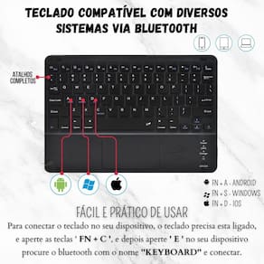 Como conectar o teclado com o dispositivo: 1 - ligue o teclado e o bluetooth do seu aparelho. 2 - no teclado, aperte as teclas fn + c. 3 - no aparelho procure o bluetooth com o nome keyboard e conecte.