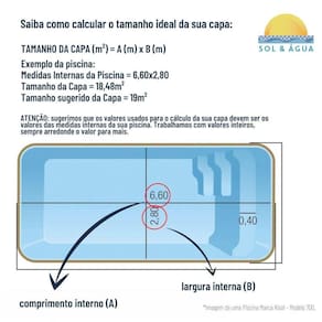 Para piscinas retangulares, basta medir o comprimento e a largura e multiplicar os valores, o resultado será a metragem de sua capa. Exemplo: Uma piscina com 8 metros de Comprimento e 4 de Largura, o cálculo será (8x4=32m).