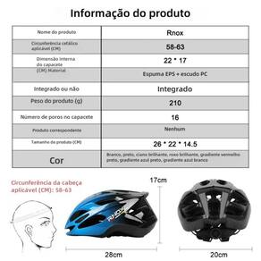 Capacete RNOX de CiclismoCaracterísticas:- circunferência cefálica aplicável: 58-63cm- Dimensão interna do capacete: 22x17cm- material: espuma EPS + escudo PC- integrado- peso do produto: 210gr- número de poros no capacete: 16- tamanho do produto: 26*22*14,5- unissexTenha um capacete respirável, com 16 poros para dissipação de calor e ventilação.Protege sua cabeça de fortes impactos e torna seu esporte mais seguro.Capacete bem leve, com design arrojado.Produto comercializado pela BLLE de excelente qualidade, beleza e custo beneficio.A empresa BLLE não aceita devoluções com as seguintes irregularidades, constantes no código do consumidor:- Rompimento dos lacres de autenticidade e garantia do produto (Cabo, QR code, etc);- Raquete com riscos e defeitos característicos de utilização do produto;- Produto danificado por queda;- Produto sujo, com sinais de exposição a altas temperaturas indevidas e exposto diretamente a água, chuva e areia.- Qualquer outra irregularidade que torne o produto inapropriado para venda como novo.OBS.:- Produto destinado exclusivamente a prática esportiva;- Manter fora do alcance de crianças;- Este produto não é um brinquedo. Marca: RNOX