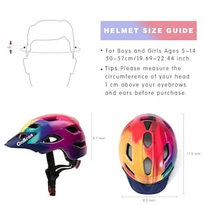 - Sistema de ajuste de capacete: os capacetes de bicicleta para crianças têm um ajustador redondo na parte traseira, que pode ser ajustado para encaixar o capacete na cabeça. O tamanho do capacete de bicicleta varia de 50-57 cm/19,65 a 22,45 polegadas, capacetes de bicicleta para crianças de 5 a 8 a 14 anos.