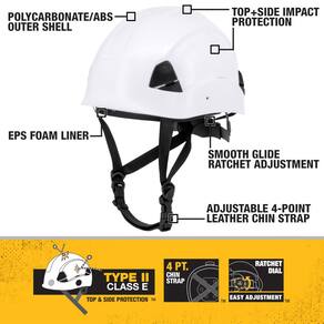 DEWALT DPG22 Capacete de segurança unissex tipo II classe E 4-Pt catraca, cor branca, tamanho adulto - Estrutura durável: o revestimento leve de policarbonato/ABS garante durabilidade sem comprometer o peso, enquanto o forro de espuma EPS oferece uma camada adicional de conforto para o uso diário. - Ajuste seguro e confortável: oferece um ajuste personalizável com uma suspensão articulada ajustável de catraca deslizante, alça de couro macio no queixo, bem como uma alça de retenção de 4 pontos ajustável, proporcionando ao usuário um ajuste confortável, seguro e de longa duração. - Proteção aprimorada: a proteção contra impactos superior e lateral é fornecida contra vários ângulos de impacto, garantindo cobertura onde a proteção geral da cabeça é necessária. - DEWALT Acessórios: Os compartimentos para acessórios permitem que esses capacetes de escalada funcionem com uma variedade de audições DEWALT e outros acessórios, consulte as opções DPG660 ou DPG22-SH. - Conformidade com a indústria: Atende aos padrões ANSI/ISEA Z89.1 Tipo II Classe E, indicando adesão aos padrões de alta qualidade e segurança na proteção da cabeça. - Instruções de cuidados: o forro é removível e lavável na máquina, enquanto o capacete em si deve ser limpo com um pano limpo e inspecionado quanto a qualquer dano antes do uso.