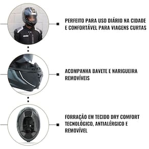 Combinando design sofisticado em branco, preto e cinza fosco e funcionalidade premium, ele é ideal para pilotagem urbana, garantindo proteção certificada pelo selo NBR 7471 do Inmetro.