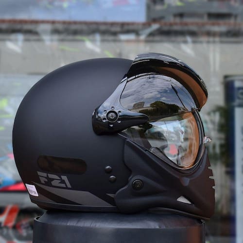 O capacete F-21 da Peels é um modelo (aberto) urbano com a opção da queixeira removível, com muito estilo e design único ao melhor estilo aviador.O F-21 da Peels é para quem procura por um capacete com design diferente e mais agressivo para pilotar a sua moto seja para o trabalho ou lazer. Ele é um capacete para uso urbano, ideal para quem deseja a praticidade e design de um capacete fechado, mas gostaria de ter a versatilidade de um capacete aberto, com conforto e excelente acabamento.O modelo conta ainda com o requinte de duas viseiras bolhas “cristal” e “fumê – mais proteção e praticidade para o piloto em dias de muito sol”. Os detalhes dos seus componentes e funcionalidades, com design ousado colocam entre os melhores e mais bonitos capacetes do mercado.O capacete Peels F-21 possui o casco injetado em termoplástico de alta absorção, decoração em decal com verniz protetor e pintura mais resistente, queixeira removível (sendo possível utilizar o capacete de maneira totalmente fechado ou aberto), revestimento interno removível e lavável em tecido antialérgico, forração ergonômica (melhor encaixe na cabeça) e com nuqueira (melhor vedação), duas viseiras (cristal e fumê) em policarbonato de 2mm e tratamento antirrisco, viseira de troca rápida e ampla variedade de cores.