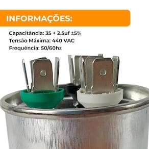 O Capacitor Duplo 35 UF + 2,5 UF 440V é uma solução ideal para sistemas de refrigeração e climatização, projetado para auxiliar no arranque de compressores e circuitos elétricos Com um princípio de funcionamento que permite armazenar e liberar energia de forma eficiente, esse capacitor duplo, que combina capacidades de 35 UF + 2,5 UF em um único componente, garante um desempenho otimizado, essencial para a operação suave e eficaz de motores Construído com um corpo de alumínio, oferece robustez e resistência, suportando condições adversas e garantindo a durabilidade necessária em aplicações desafiadoras