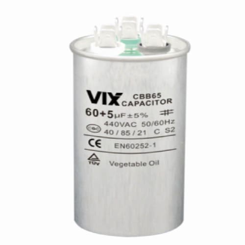 O Capacitor Duplo Vix 40+5 MF -440 Volts tem vantagens de baixa dissipação, alta resistência de isolamento, bom caráter de autocura, corrente anti-choque, forte capacidade de sobre-portadora e desempenho elétrico estável e segurança confiável com dispositivo anti-explosão interno.