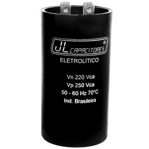 Marca: JL Capacitores Modelo: Eletrolítico Cor: Preto Frequência: 50/60Hz Conector: Tipo Terminal, Duplo ou Simples Capacitância: 124-149UF Voltagem máxima: 127 volts Temperatura mínima de operação: 0° Temperatura máxima de operação: 70°