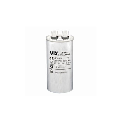 O Capacitor Permanente Vix 45uF - 250v tem a vantagem de baixa dissipação, alta resistência de isolamento, bom caráter de auto cura, corrente anti-choque, forte capacidade desempenho elétrico estável e de segurança confiável com dispositivo anti-explosão interno.