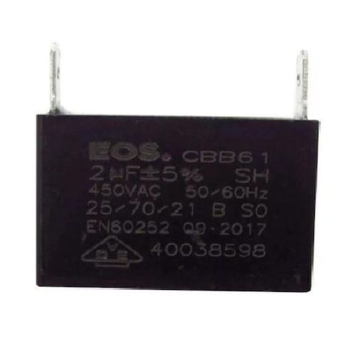 Capacitor para ar condicionado e evaporizador e uso geral Marca: eos Modelo: capacitor Código: d10222 Capacidade: 2uf +- 5% sh Voltagem: 450 vac Frequência: 50/60hz Ean: 7895031264971