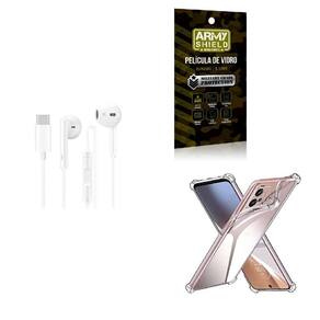 Kit Capinha Moto E23 AntiShock Transparente + Fone de Ouvido Tipo C Estéreo - EJ-105 + Película de Vidro 3D Frontal