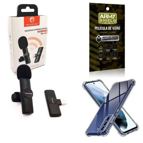 Microfone Sem Fio Profissional com presilha Tipo C H'maston O Microfone Sem Fio Profissional com presilha Tipo C H'maston de alta sensibilidade com captação de áudio 360 graus, possui resposta rápida para que você grave todos os detalhes de som Qualidade de som pura, comparável a uma equipe de gravação profissionalEste Microfone Sem Fio H'Maston MK-04 Wireless 360 com Interface USB-C para SmartPhone e Tablets Android, além de PC com entradas USB-C Type-C , possui uma alta qualidade de som, é portátil e muito fácil de usar, sendo Plug and play apenas colocar em seu smartphone e usar. O Sistema Wireless de Microfone Lapela para Equipamentos USB-C possui Bateria Interna com duração de até 10 horas e trabalha com uma distância de até 20m. O Microfone Sem Fio Profissional com presilha Tipo C H'maston é emparelhado automaticamente imediatamente após a conexão, sem necessidade de aplicativos, sem fios irritantes, sem depuração, apenas conexão instantânea Principais Características: Plug and play, conexão de um clique, fácil de usar. Áudio limpo e preciso e mão livres ao gravar Conector USB-C para SmartPhone e Tablets Android Captação de áudio sem ponto cego de 360 grau Latência muito baixa de 9 milissegundos Alcance de até 20 metros em locais sem obstáculos Função antirruído do circuito de redução de ruído Bateria Interna com duração de até 10 horas Qualidade de som pura e alta sensibilidade Compatível com uma variedade de dispositivos Adequado para todos os tipos de transmissão ao vivo, gravação, entrevista, gravação de vídeo, Vlogs, Youtubers, aulas online e muito mais.-------------Película de Vidro 3D Blindada - ArmyshieldA película de vidro 3D para celular é um produto de alta qualidade que oferece proteção e estilo para o seu dispositivo móvel. Feita de vidro temperado de alta resistência, a película é projetada para se encaixar perfeitamente na tela do seu celular, proporcionando uma cobertura completa e proteção contra arranhões, rachaduras e outros danos.A película de vidro 3D é especialmente projetada para se curvar suavemente ao redor das bordas do seu celular, criando uma aparência elegante e sem bordas. Isso significa que você pode desfrutar de uma experiência de visualização imersiva e sem interrupções, sem se preocupar com a película descolando ou interferindo na sensibilidade da tela.Atenção: O produto acompanha apenas o que apresenta na imagem.