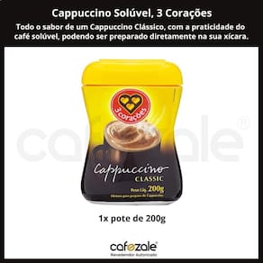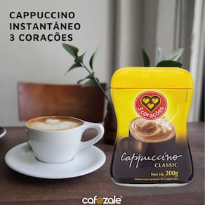 O Cappuccino 3 Corações é resultado da criatividade brasileira. Elaborado à base de café, leite, cacau e canela, seu sabor, textura aveludada e cremosidade, se distingue dos demais.Sobre o Cappuccino Instantâneo 3 CoraçõesUma bebida para você fazer diretamente na sua xícara.Preparado rapidamente com a praticidade de um café solúvel.Muito cremoso e saboroso.Faça com água quente ou leite.Conteúdo 1 pote com 200g de mistura para preparo de Cappuccino. Observações Validade: 6-12 MesesFabricado no Brasil