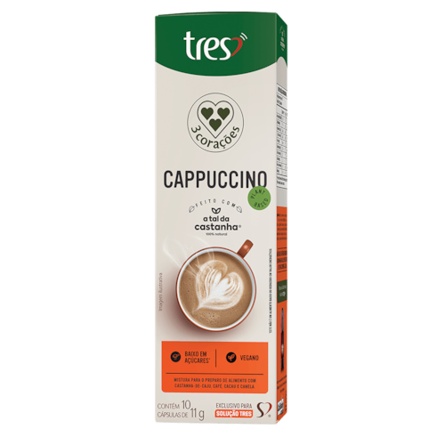 A cápsula Cappuccino Vegetal leva à sua mesa o sabor inconfundível do café 3 Corações feito com o leite vegetal a base de castanha-de-caju A Tal da Castanha, de um jeito muito prático e 100% vegetal, aquela que é a melhor companheira do brasileiro para começar bem o dia. Uma bebida saborosa, cremosa, é a alternativa perfeita ao leite, sem conservantes, livre de glúten, soja e lácteos. A cápsula é de uso exclusivo nas máquinas Tres. O produto vem em 10 unidades de 11 gramas cada. Ideal para veganos, vegetarianos e pessoas com dietas restritivas.