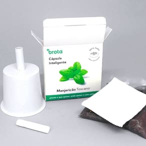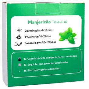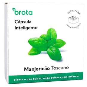 Informações/Dicas/Usos * A cápsula é um refil para Horta Inteligente Clássica e com Led da Brota * Tempo de Germinação: 4 - 10 dias * Colheita: 14 - 21 dias * Saboreie por: 90 - 120 dias Conteúdo* 1 Capsula de solo inteligente (terra+ nutrientes) * 1 Saquinho com sementes de Manjericão Toscano. * 1 Filtro de irrigação automática