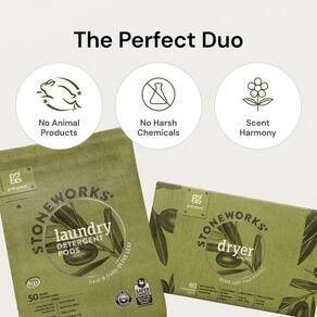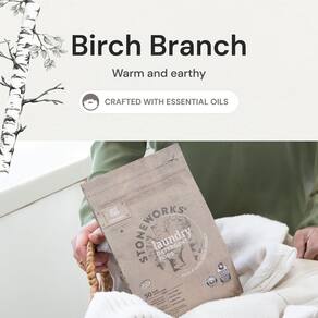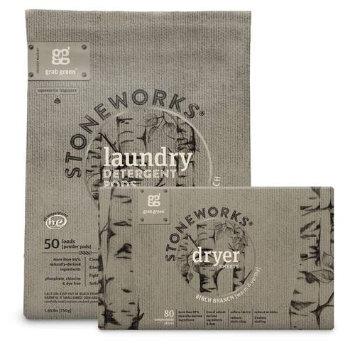 Grab Green Stoneworks Conjunto de cápsulas de detergente para roupas e folhas de secador, 50 cápsulas e 80 folhas de secadora, aroma de ramo de bétula, conjunto de cuidados de lavanderia à base de