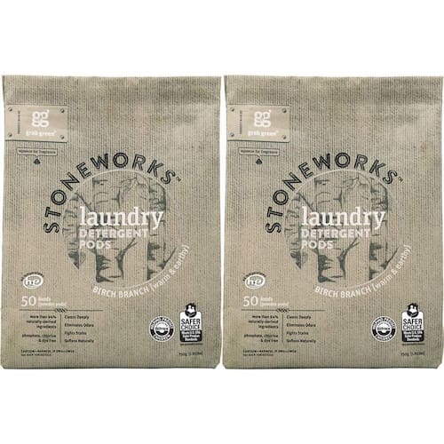 - Contém: 2 - 50 sacos de cápsulas de detergente para roupas Grab Green Stoneworks Birch Branch (100 cápsulas no total)
