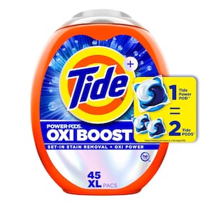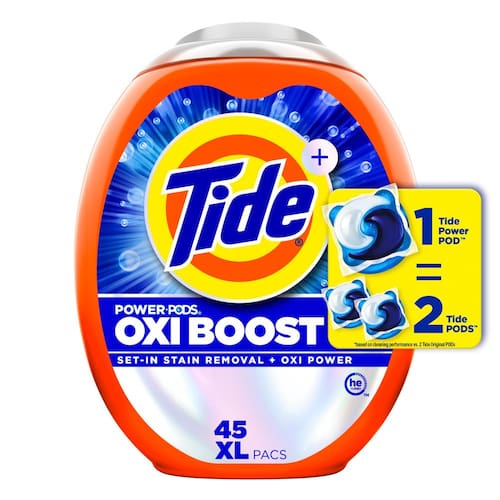 - Inclui um pacote de 45 unidades de detergente para roupas Tide Oxi Boost Power, cápsulas para roupas com removedor de manchas avançado e Oxi Power