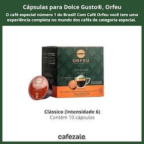 Orfeu Clássico em cápsulas é um café 100% Arábica, equilibrado e de torra média. Apresenta notas florais, frutadas e de caramelo. Possui doçura alta, acidez equilibrada, corpo aveludado e aromas complexos, com uma finalização persistente e prazerosa. Sua intensidade é equivalente a 6. E a dosagem indicada para um espresso é de 40ml.