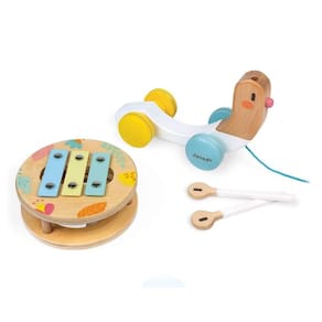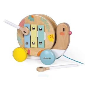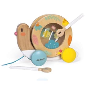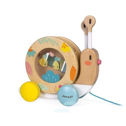 Este caracol musical nunca está preocupado! Este divertido caracol de madeira para passear com as suas bonitas cores primaveris vai divertir os mais pequenos a partir dos 1 anos. A concha gira quando você a caminha e pode ser removida para revelar um pandeiro e um pequeno xilofone!