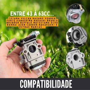 Carburador para roçadeira Modelos: 43/52cc Diâmetro do venture: 15 mm Compatibilidade: toyama, branco garthen, nakashi, trapp shindaiwa, kawashima, yamasaki e outras marcas. Embalagem: 1 carburador + 1 junta do carburador. Marca: Não Informado Ean: 7891686522480