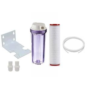 1x carcaça de 10 polegadas transparente rosca 1/4 1x suporte simples para 1 carcaça branco/ zincado 2x conectores reto rosca 1/4 para ligação 2x metros de mangueira branca 1/4 1x refil plissado absoluto 0,22m