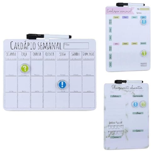 Benefícios do Produto Organização semanal planeje todas as refeições da família e economize tempo na cozinha. Versatilidade de uso pode ser fixada na parede ou em superfícies metálicas como a geladeira. Fácil de limpar escreva, apague e atualize o cardápio quantas vezes quiser. Design compacto tamanho ideal para ser visualizado com facilidade (28 21,5 cm). Praticidade para o dia a dia ajuda a manter uma dieta equilibrada e evita esquecimentos.