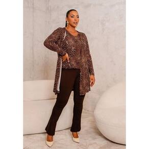 Cardigan Feminino Plus Size Oncinha Este elegante cardigan de manga longa com estampa de oncinha é uma peça chave para um guarda-roupa sofisticado e moderno. As fendas laterais adicionam um toque de ousadia ao design, permitindo movimento e um caimento fluido. A combinação de viscose e elastano na composição do tecido oferece uma experiência de uso extremamente confortável e flexível, sem abrir mão da durabilidade. Seu padrão de oncinha é atemporal e versátil, tornando-o perfeito para complementar uma variedade de looks, desde os mais casuais aos mais refinados.