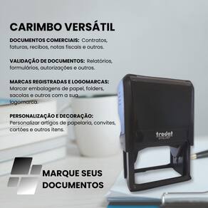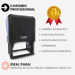 CARACTERÍSTICAS E BENEFÍCIOS: · Qualidade Inigualável: Fabricados com os mais altos padrões de qualidade, os carimbos Trodat oferecem impressões nítidas e consistentes em todas as utilizações. · Personalização Flexível: Adicione seu logotipo, informações de contato ou qualquer texto personalizado para atender às suas necessidades específicas. · Durabilidade Superior: Construídos para resistir ao uso frequente, esses carimbos são projetados para proporcionar anos de desempenho confiável. · Facilidade de Uso: Com um design ergonômico e mecanismo de carimbagem suave, os carimbos Trodat garantem uma experiência de carimbar sem esforço. · Versatilidade: Seja no escritório, em casa, empresa ou em sua loja, os carimbos Trodat oferecem versatilidade para uma variedade de aplicações. · MEDIDA: 40X60mm · TINTA: Já vai abastecido com tinta preta para aproximadamente 3 mil carimbadas.