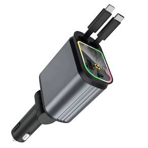 Carregador veicular inteligente de 66W com 2 cabos retráteis (USB-C e Lightning) e 2 portas adicionais (USB-C e USB-A). Carrega até 4 dispositivos simultaneamente. Compatível com veículos 12V e 24V. Possui projetor de luz ambiente integrado, plugue ajustável em 180°, proteção contra sobrecarga e curto-circuito.Tipo