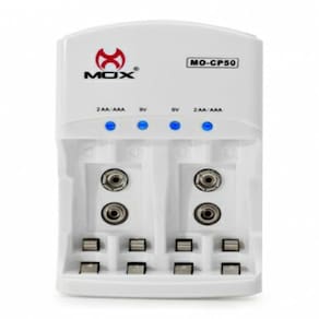 Carregador Super rápido MO-CP50 Carrega 4 pilhas AA, 4 AAA ou 2 baterias 9v entre 6 e 8 horas, Bivolt automático, "Auto Stop" - desliga automaticamente quando a carga estiver completa, Possui 4 canais de carga independentes, Plug articulado. Entrada:110-220V 50/60HZ 50 mA Saída:DC 2.4V-400 mA AA/AAA AA 200 mA*2 AA 200mA * 4 AAA 200 mA*2 AAA 200 mA*4 9V DC 20 mA Selo de segurança INMETRO N° 14.2135 Ean: 7898563935678