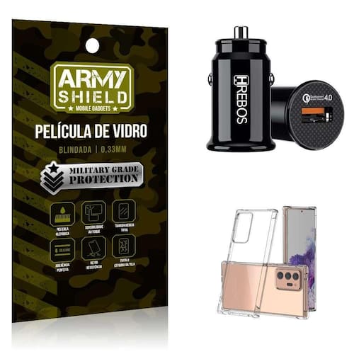 Carregador veicular com chipset inteligente e proteção contra surtos. Capa anti shock em TPU. Película de vidro temperado com bordas curvas.Características