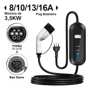 Carregador Carros Elétricos 3,5 Kw Cabo 5 Metros Características principais: PLUGUE: Padrão Brasileiro Bolsa de Armazenamento Entrada: 110 - 220V AC ChargingCurrent: 8-10A-13A-16A ajustável. ele irá carregar o seu carro com a mesma corrente da próxima vez. Comprimento do Cabo: 5 metros Potência: 3.5KW Vida mecânica: plug in/out MAIOR 10000 vezes Impacto da força externa: pode pagar 1m queda e 2t veículo correr sobre a pressão Isolamento resistência:MAIOR 1000MD DC500V Terminal temperatura aumento: MENOR 50K Avaliação do fogo do alojamento: UL94V- Control Box Função: Proteção 1. Leakage 2. Proteção de sobretensão ou de baixa tensão Proteção 3. Over-load Proteção 4. Lightning Proteção 5. Over-heat 6. Mude a corrente: 8A/10A/13A/16A Display LED: Temperatura 1. Charging Corrente 2. Charging Tensão 3.Charging 4. Energia Carregada em KW/h 5. Tempo carregado. 6. Conjunto Curren Homologação Inmetro: CE-BRI/IQB 002755 54760/21-010