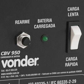 Detalhes técnicos: Modelo: CBV 950; Capacidade de carga da bateria: 25Ah - 90Ah; Tensão de saída do carregador de bateria: 12V; Corrente de carga da bateria: carga lenta 7A / carga rápida 9A; Tensão: 220V; Corrente de entrada (A): 0,65A; Frequência: 60Hz; Comprimento do cabo da garra: 1,40m; Comprimento do cordão elétrico: 2,0m; Dimensões (C x L x A): 210mm x 265mm x 170mm; Segue norma: IEC 60335-1 e IEC 60335-2-29; Massa aproximada (peso): 4,3kg; Garantia: 90 dias.