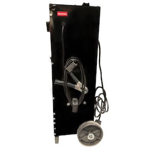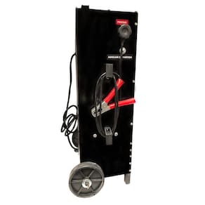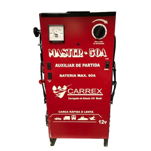 Carregador de bateria automotiva possui fácil manuseio. Equipado com alça e rodas para facilitar o transporte, oferece praticidade e desempenho.