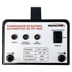 Carregador de bateria automotiva para baterias 12v, com duas opções de carga, lenta flutuante 2ah e rápida 5ah . Lenta flutuante: nessa opção pode deixar o carregador conectado a bateria por dias que ele entra em flutuação e após acender o led bateria carregada ele manda uma corrente muito baixa para a bateria. Rápida: nesta opção para a bateria de carros, após 30 minutos de carga já será possível dar Partida no veículo. Dica de como saber o tempo de carregamento da sua bateria: Exemplo se a bateria for de 60ah: Rápida: t=ah/5 t=60ah/5 t= 10horas. Lenta: t=ah/2 t=60ah/2 t= 30horas. Ideal para baterias de carro, moto, barco e caminhão. Diferenciais: Proteção térmica Carga rápida Carga lenta flutuante Com fusível Informações técnicas: Marca: protection Modelo: pt-450 Material: metal Voltagem: bivolt 110/220 possui chave seletora Tomada: 10a Saída : 12v 5 ah Frequência: 60kwh Potência: 60w Dimensões: Altura: 8 cm Largura: 11,7 cm Profundidade: 14 cm Comprimento do cabo da tomada: 1,30 m Comprimento do cabo das presilhas: 1 m Peso: 1,30 kg Itens inclusos: 1 carregador de bateria 2 cabos conectores 1 cabo para tomada de 12 meses Marca: Não Informado